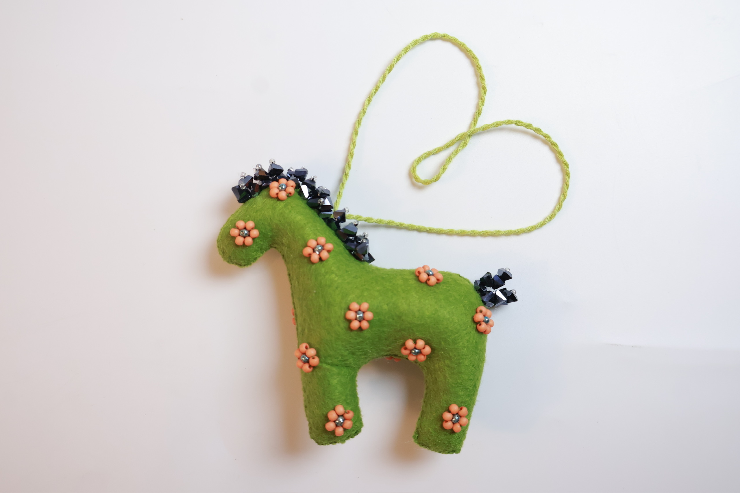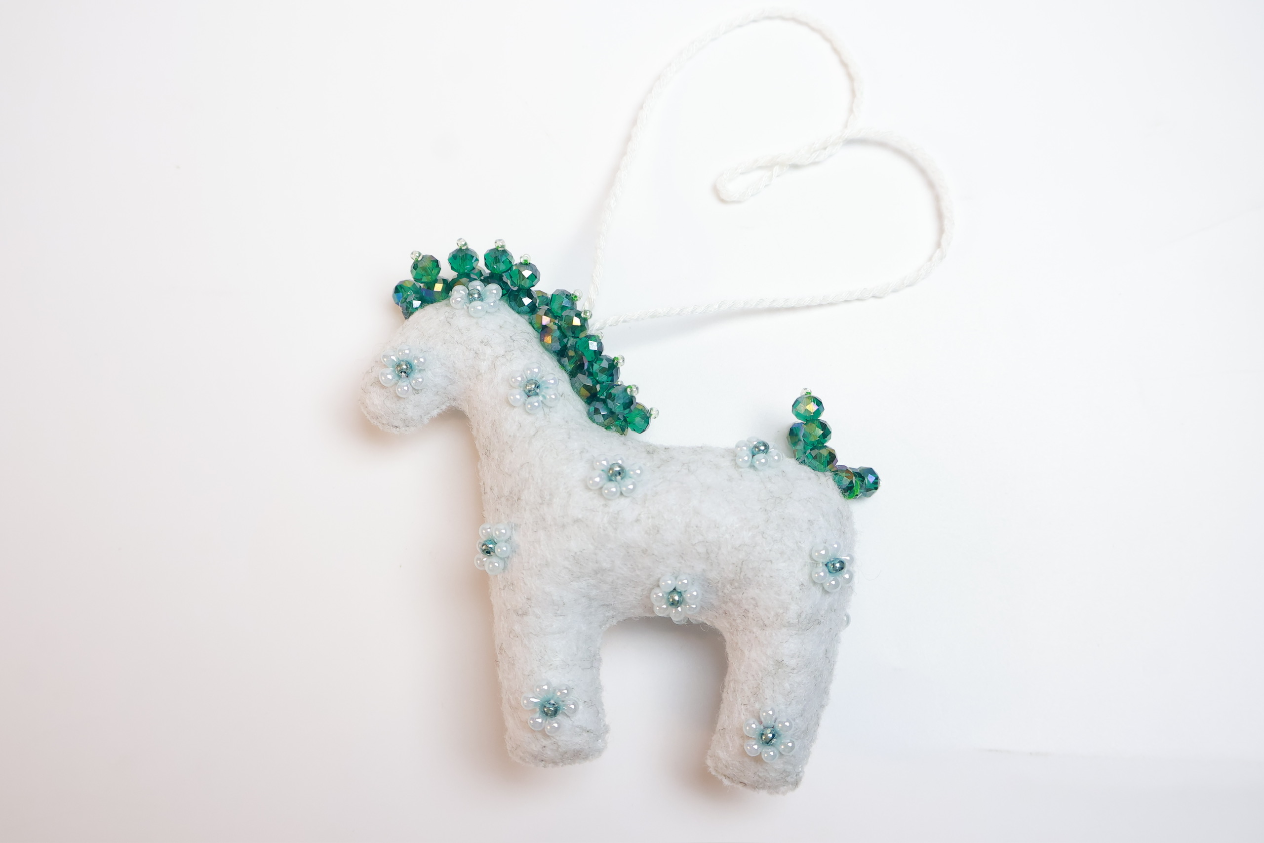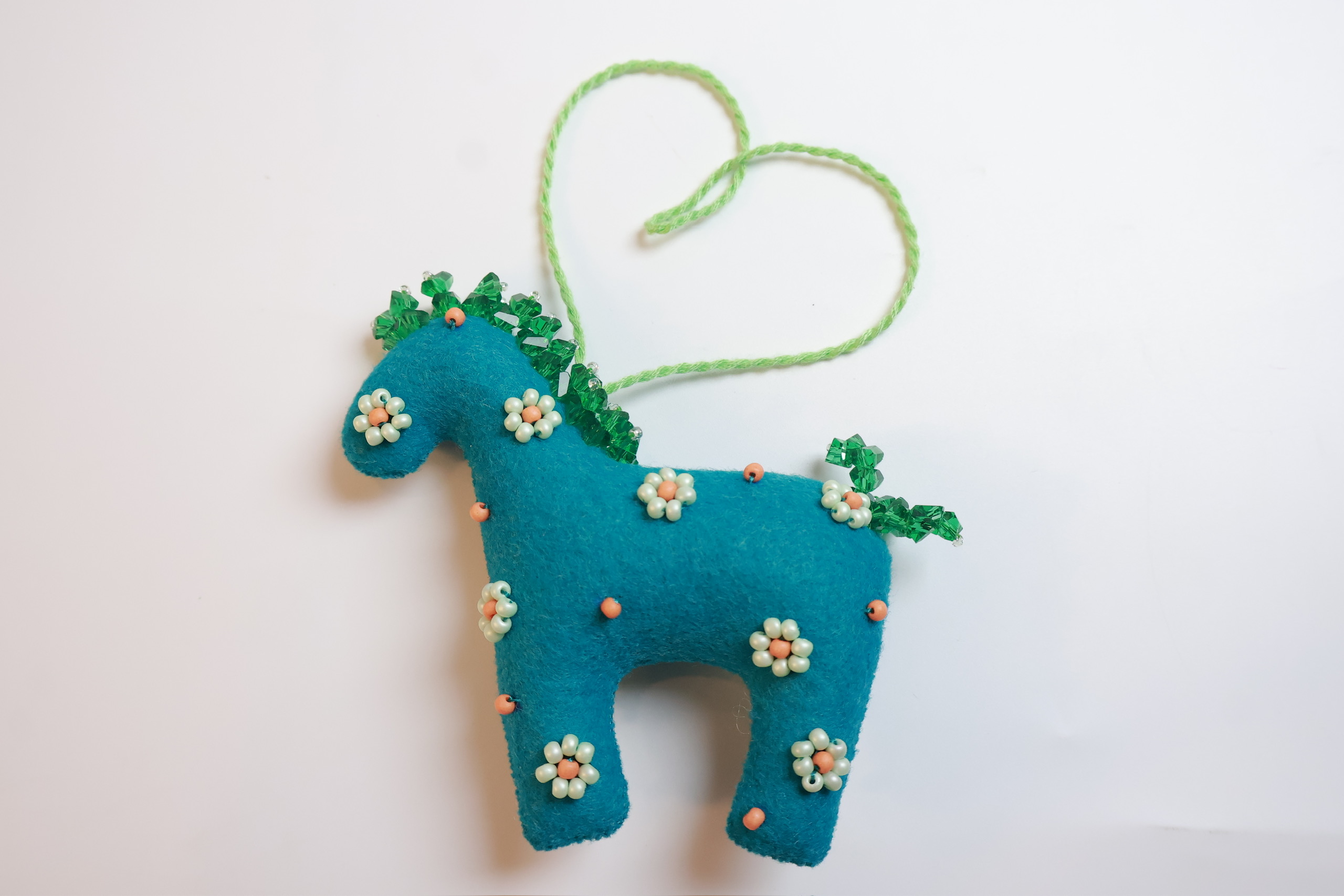 Bờm và đuôi được nhấn bằng các sợi cườm đa sắc, tạo hiệu ứng lấp lánh khi có ánh sáng chiếu vào