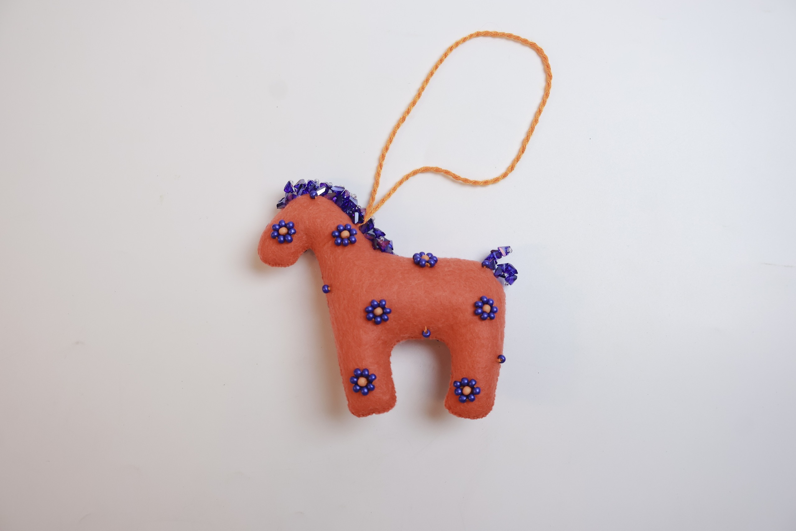 Thân ngựa được trang trí bằng các họa tiết hoa tinh xảo, tạo nên từ cườm xanh nhạt và trắng tinh khiết