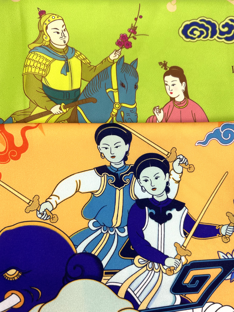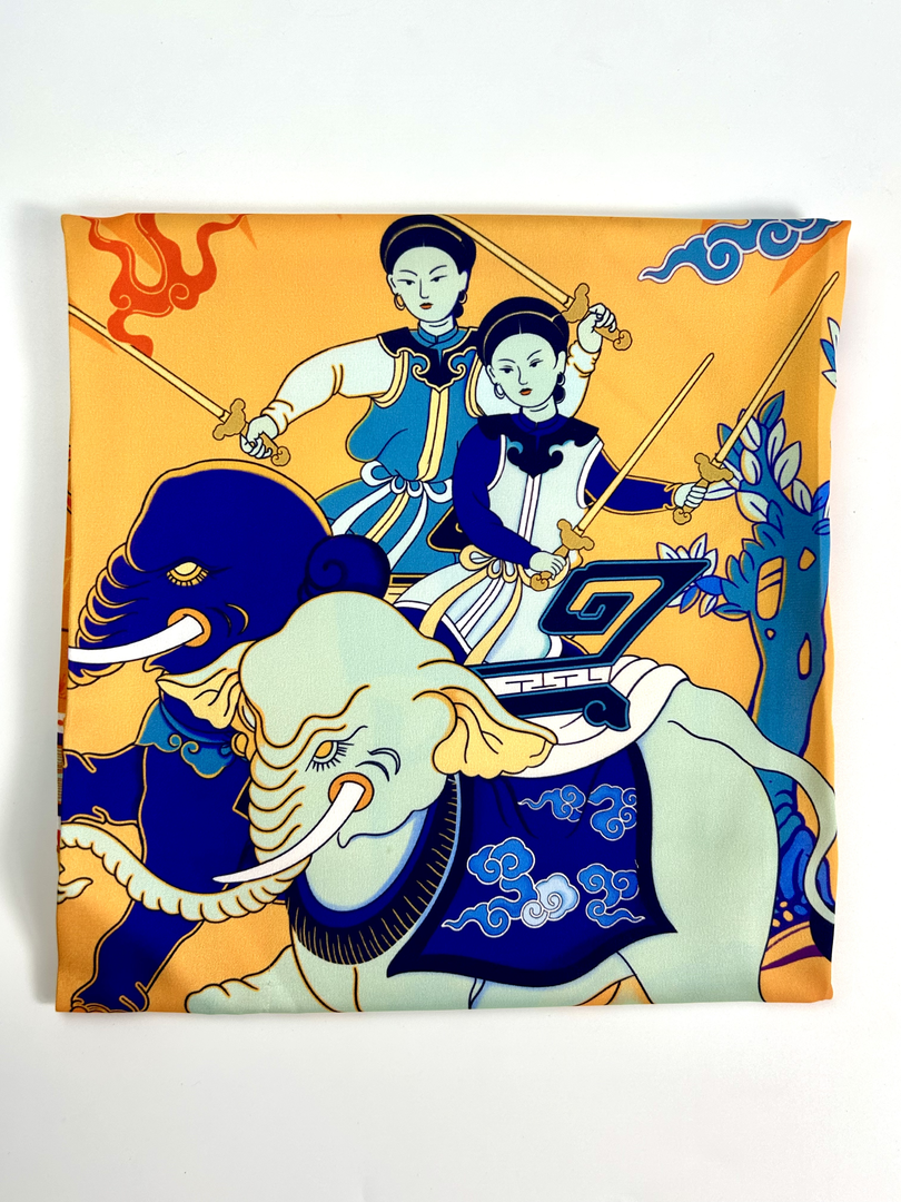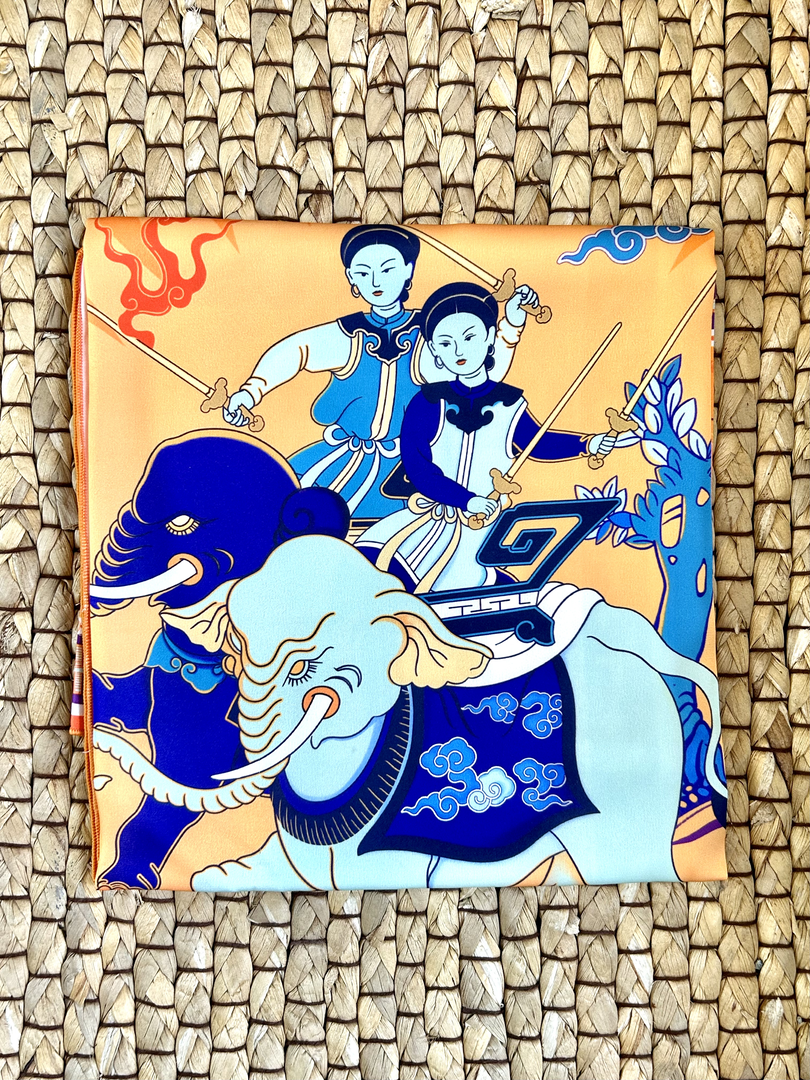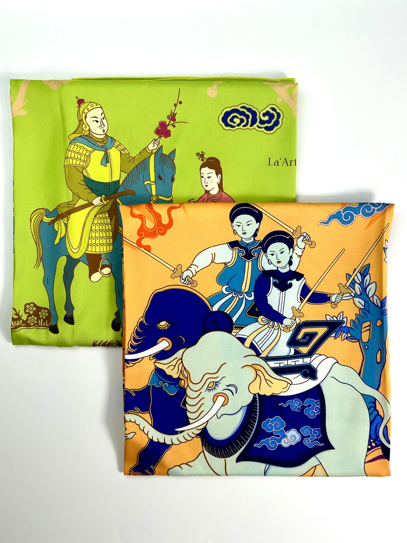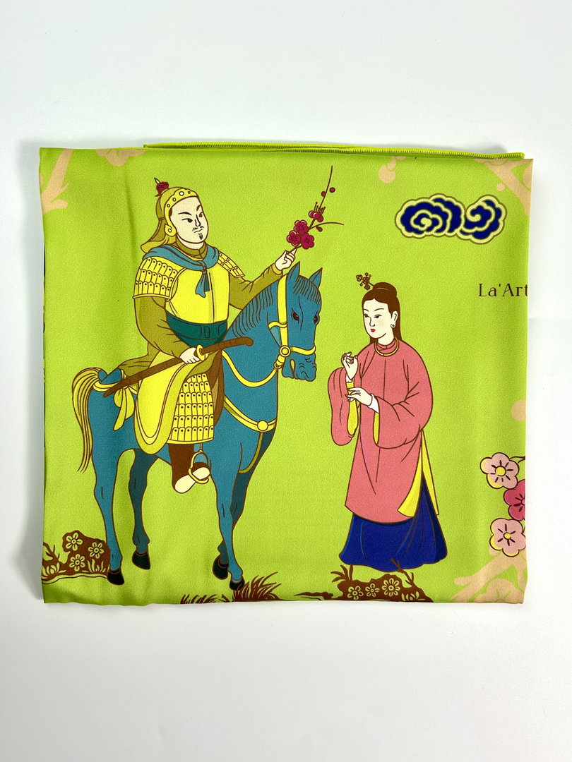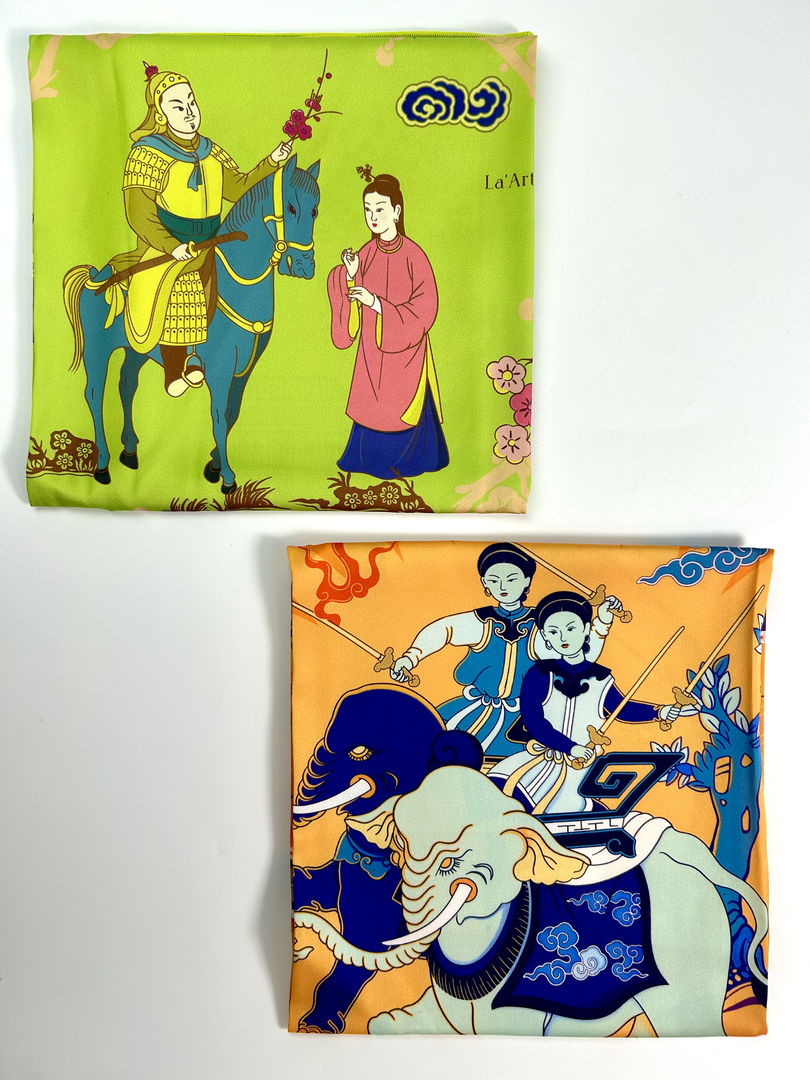 Chiếc khăn lụa mỏng nhẹ, mềm, mướt, không chỉ có sự thanh thoát của chất liệu cao cấp mà còn là dòng chảy của hàng ngàn năm lịch sử dân tộc. Mỗi chiếc khăn là một bức tranh sống động tái hiện những hình ảnh mang tính biểu tượng của lịch sử Việt Nam. Không chỉ đơn thuần là phụ kiện thời trang độc đáo, sang trọng, mỗi chiếc khăn lụa còn là tình yêu nghệ thuật, niềm tự hào dân tộc, sự trân trọng văn hóa truyền thống và mong muốn lan tỏa giá trị, lịch sử Việt Nam.
