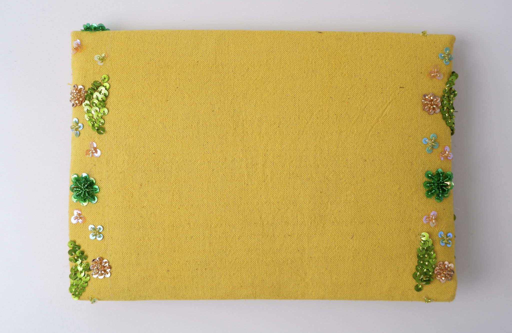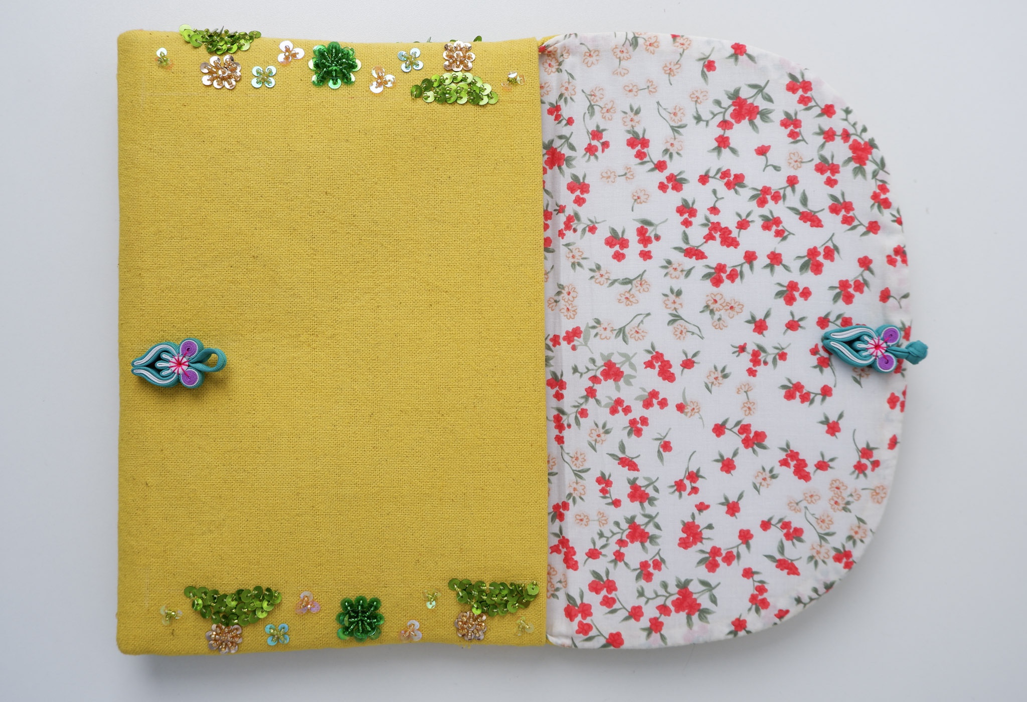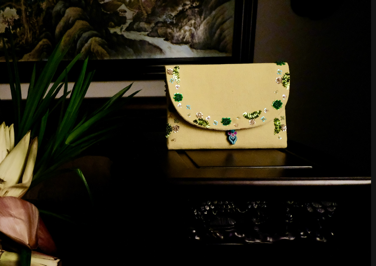 Mặt trước trang trí hoa thủ công và đính hạt, lấy cảm hứng từ nghệ thuật dân gian truyền thống