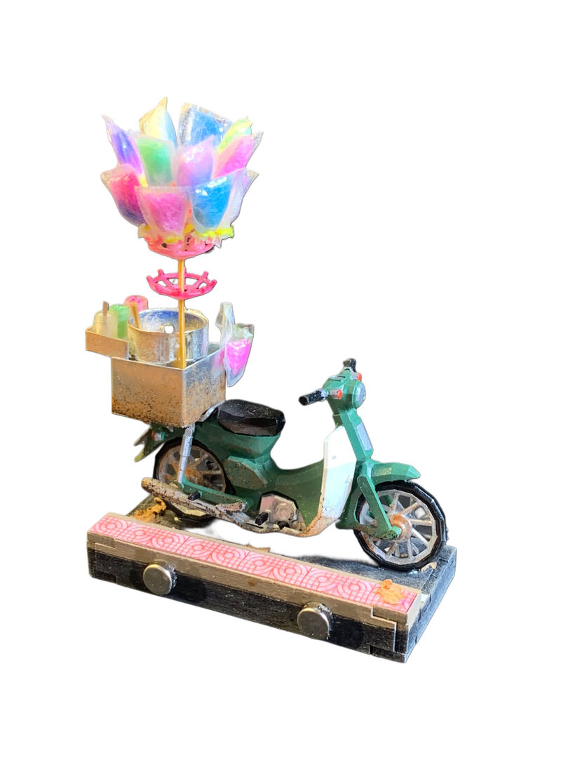 Xe bán kẹo bông gòn được mô phỏng thu nhỏ theo tỷ lệ 1/35, mang theo hình ảnh một chiếc xe đạp với rất nhiều kẹo bông gòn. Là mảnh ký ức của bao lứa học sinh, là niềm vui thú khi tan trường. Có thể chúng ta quên vị ngọt gắt đó nhưng chưa bao giờ quên đi hình ảnh chiếc xe ngọt ngào này.