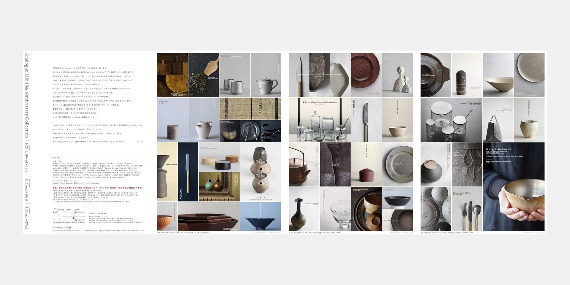 *掲載の写真は10年間に開催した展示DMのアーカイブです。今回展示される作品とは関係ありません。The photos below are a collection of our exhibition mailers from the past 10 years. They do not represent the work that will be shown in the Anniversary Exhibition.